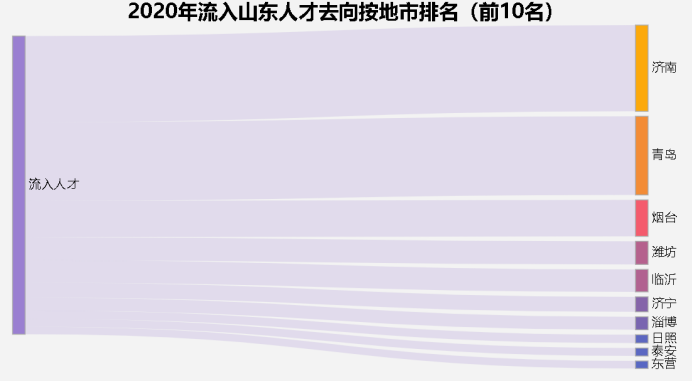 从2020年流入山东的省外市场化就业人才去向看,济南(26.68%)、青岛(24.33%)、烟台(11.26%)、潍坊(7.15%)、临沂(6.93%)是省外市场化就业人才省内流向最多的5个地区,共占流入山东市场化就业人才总数的76.35%。